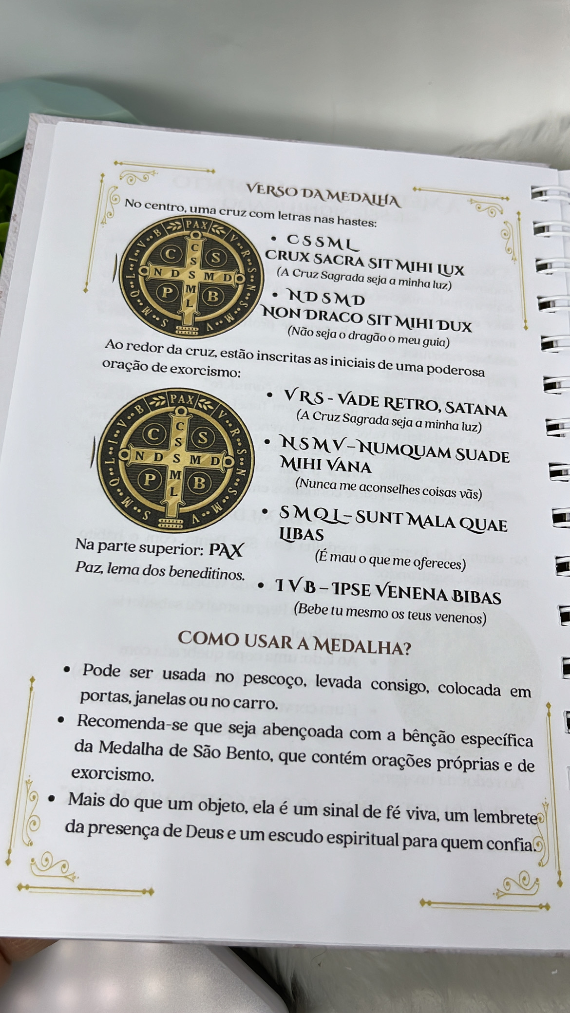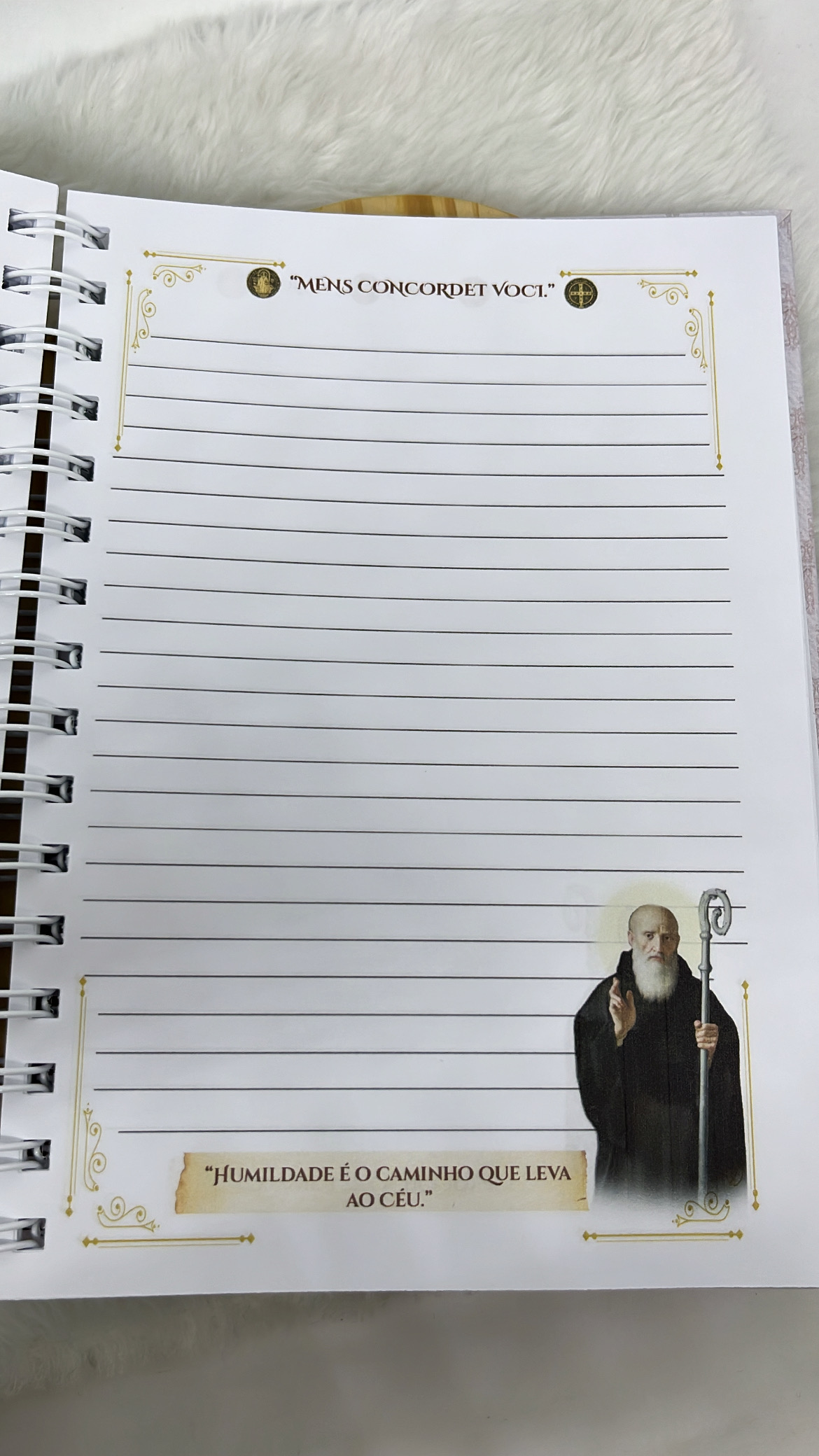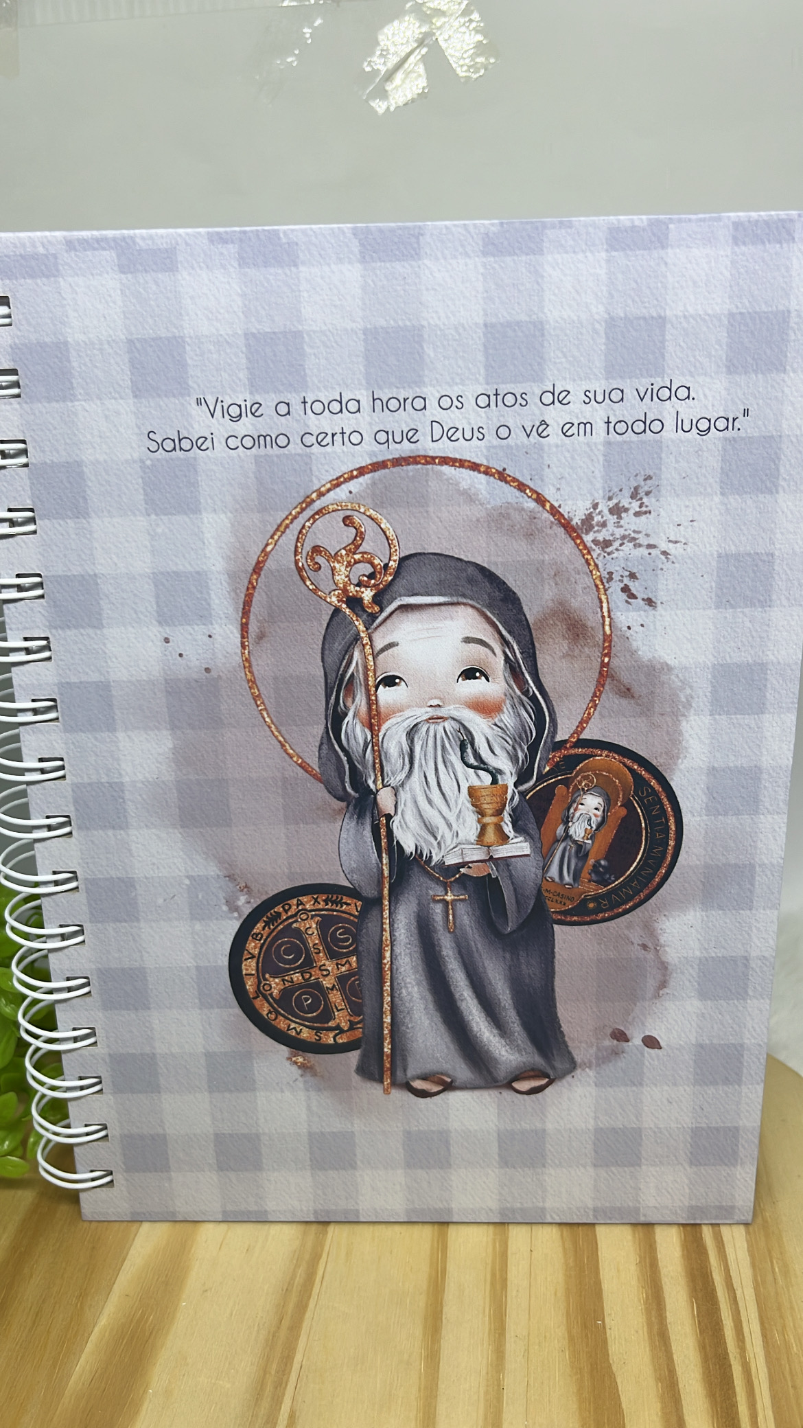 Com uma capa elegante e delicada, ilustrada com São Bento e elementos da sua medalha, cada detalhe transmite paz, proteção e espiritualidade.